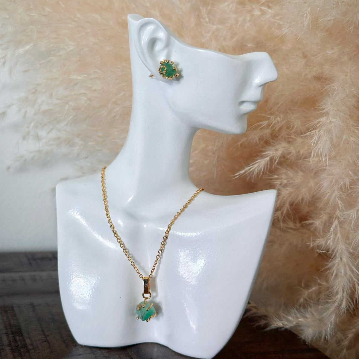 Elevate your everyday style with these handcrafted emerald green stud earrings, made with natural morralla stone, bronze, and finished with a luxurious 24K gold plating.